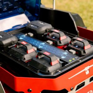 107 cm Schnittbreite • mit 4 x 10 Ah Li-Ion Akkus • mit 6-fach Schnellladegerät • geschmiedetes Mähwerk